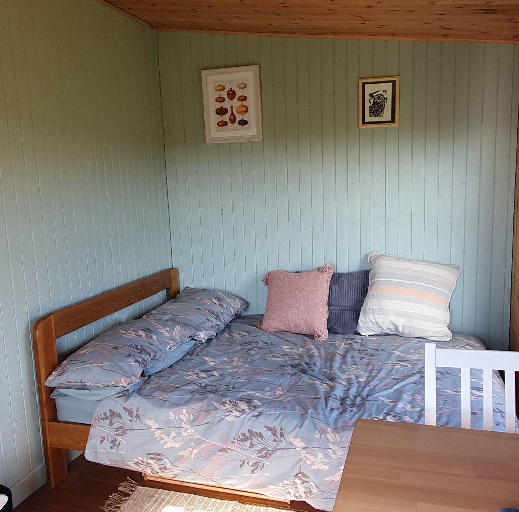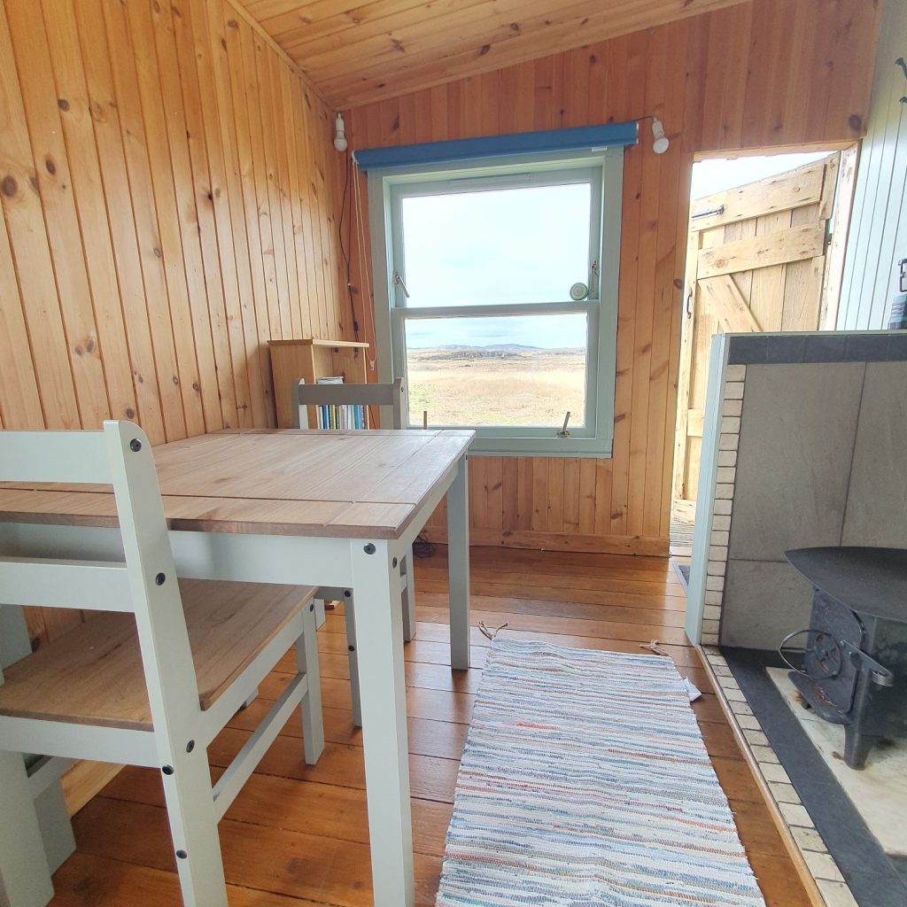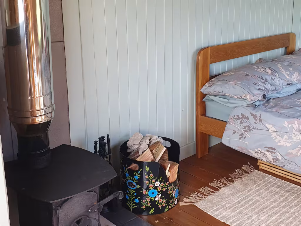 - Cosy, insulated, wood-panelled interior. Wood-burning stove. Double bed.